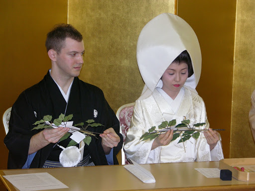 A cerimônia propriamente dita pode seguir preceitos religiosos diversos (budista, xintoísta e mesmo católico) e, sendo budista, terá lugar num templo próprio para o efeito. O xintoísmo, o mais comum no Japão, prevê a realização da cerimônia num templo ou em casa. Neste último caso, o casal usa kimonos de seda (branco para ela e preto para ele), bem como as convidadas: as mais jovens usam cores fortes e alegres e as mais idosas optam por cores mais escuras e sóbrias. A noiva é toda pintada de branco e, juntamente com o kimono, os chinelos próprios e as meias brancas, usa uma peruca enfeitada com ouro, flores e pérolas - simbolizando boa sorte.